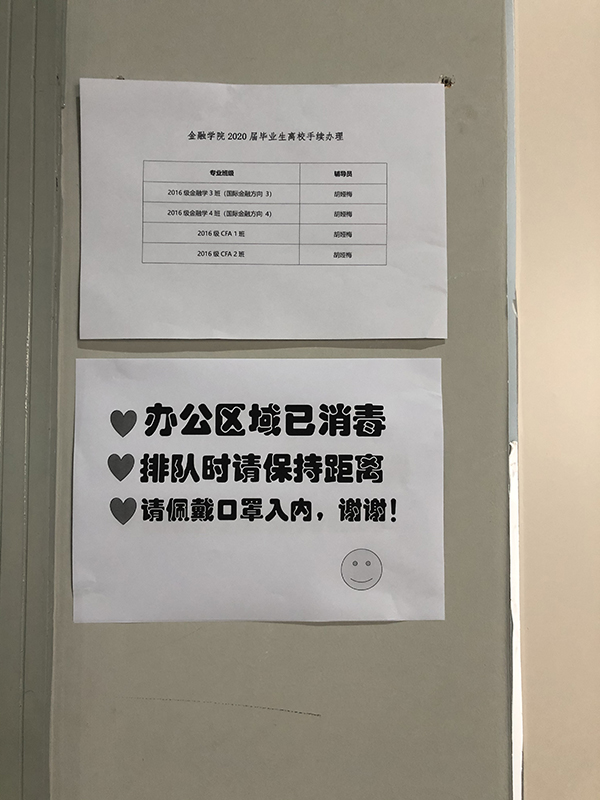 根据工作预案,学院进一步强化各项工作的细化落实,确保防疫措施不留死角,做到防疫物资、防疫提示全面覆盖。一是在第五教学楼开辟多个办公场所,为毕业生提供办理离校事宜,安排学生错峰办理避免聚集。二是做好防疫物资保障,为返校学生准备了口罩、免洗洗手液等,针对办公场地进行每日消毒,将疫情防控与精心服务落实到每一个环节。