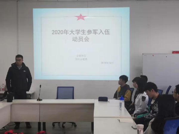 金融学院、国防金鹰团于12月12日下午在5314会议室举行金融学院征兵动员会。金融学院副书记、副院长白涛,部分学生工作者、退伍大学生代表、报名春季参军的同学、各班级同学代表参加了此次动员会。动员会由退伍大学生黄笑颖主持。