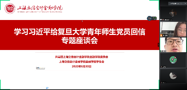 6月30日,金融学院线上举办“学习习近平总书记给复旦大学青年师生党员回信”专题座谈会。金融学院团委书记顾正云、副书记夏艺华、团学骨干和学生代表参与了本次座谈会。本次座谈会由团委指导教师管承瑜主持。