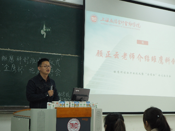 首先,顾正云老师向同学们介绍了雏鹰科创班的组建缘由,并进一步介绍了雏鹰科创班的选拔机制、课程设置、导师团队、资金支持和考核机制等。最后,顾老师向同学们提出了期望,希望金融学院的同学们能够充分利用学校资源,找准方法,在科创道路上不断前进。