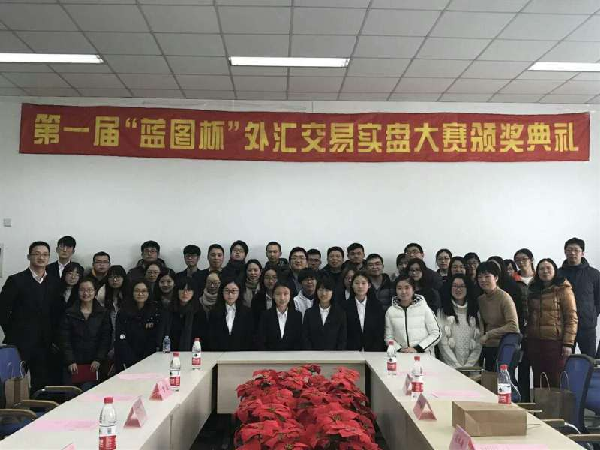 12月29日,第一届“蓝图杯”外汇交易实盘大赛颁奖典礼在我校浦东校区第五教学楼举行。上海数融资产管理有限公司董事长邹培杰、产品总监施慧、金融学院党委书记姜雅净、党委副书记、副院长褚红素、副院长殷林森、陈文政等6名指导老师及获奖同学参加本次颁奖典礼。
