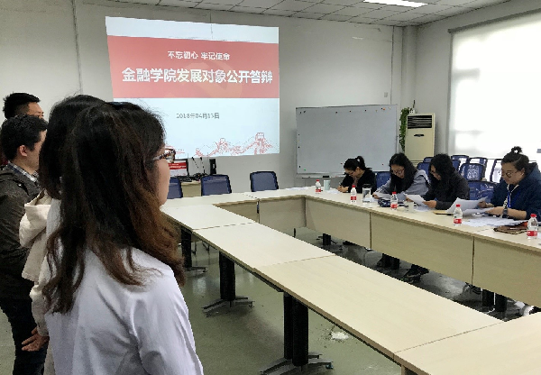 4月13日下午,金融学院在第五教学楼314会议室召开2018年上半年发展对象公开答辩。金融学院党委副书记、副院长褚红素、全体学生党支部书记以及六十余位发展对象候选人到场出席。