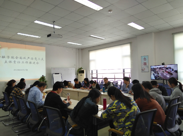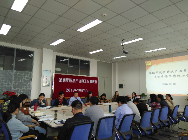2018年10月17日下午,金融学院在浦东校区5314会议室和松江校区7103会议室同步召开了全面从严治党三大主体责任工作推进视频大会。学院全体党委委员、班子成员、全体党支部书记、党支部支部委员、团委书记出席会议,会议由学院党委书记姜雅净主持。