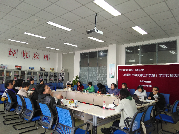 为深入学习贯彻党的十九大精神和习近平新时代中国特色社会主义思想,贯彻落实新时代党的建设总要求,提高党的建设质量和水平,充分发挥基层党支部的战斗堡垒作用,提升基层党务工作者政治素养和履职能力,金融学院党委成立“党务工作者思想理论加油站”,并于3月22日在第五教学楼314会议室举行了启动仪式,组织了第一期《中国共产党支部工作条例(试行)》专题学习。金融学院党委书记姜雅净、党委副书记、副院长褚红素、全体党支部书记和党务工作者出席了本次活动。