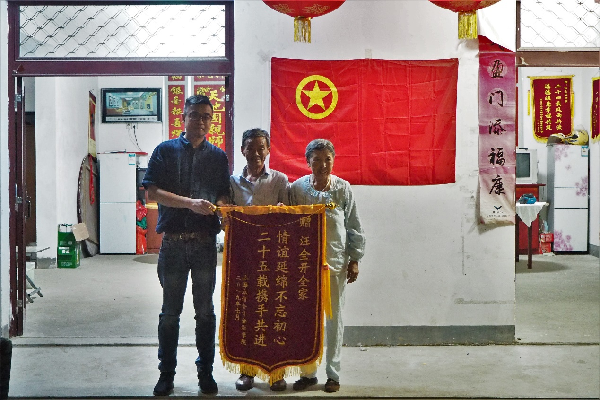 15日晚,实践团临时团支部开展“不忘初心,为梦前行”主题团日活动。实践团成员用朗诵、歌唱的形式表达了自己参加此次实践活动的所思、所感、所悟。活动中,金融学院党委副书记、副院长白涛向大力支持我校社会实践活动的农户汪叔汪婶、三叔三婶赠送锦旗,对他们25年来坚持不懈、风雨无阻为我校大学生社会实践团提供帮助表示诚挚感谢。