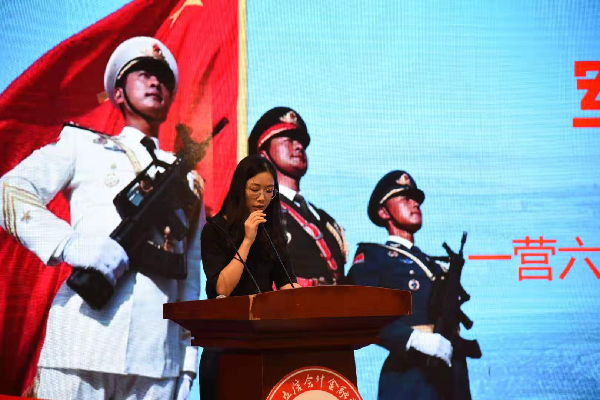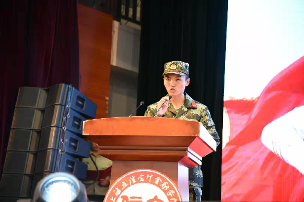 2017级金融工程1班的退伍大学生王睿在《一日参军,终身为兵》的主题发言中分享了作为军人的亲身经历,介绍了大学生当兵的福利政策,当兵给他带来的精神收获,当兵使他内心蜕变、思想成熟。他号召新生们走出舒适区,走入军营,报效国家。新生代表2019级金融学类2班张家瑞同学关于本次军训提出了倡议:提高认识,居安思危,牢固树立保家卫国的国防意识。严明纪律,听从指挥,牢固树立令行禁止的纪律意识。端正态度,自立自强,牢固树立互帮互助的团队意识。在每位同学努力下,金院2019级新生军训一定会取得优异成绩。