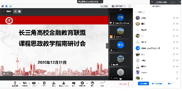20201231日上午,长三角高校金融教育联盟高校通过腾讯会议召开了“金融学科课程思政教学指南”研讨会。安徽财经大学金融学院、安徽大学经济学院、南京财经大学金融学院、南京农业大学金融学院、上海对外经贸大学金融管理学院、上海师范大学商学院、浙江工商大学金融学院和我校金融学院等高校教师代表参加会议。会议由我校金融学院主持工作副院长张云教授主持。