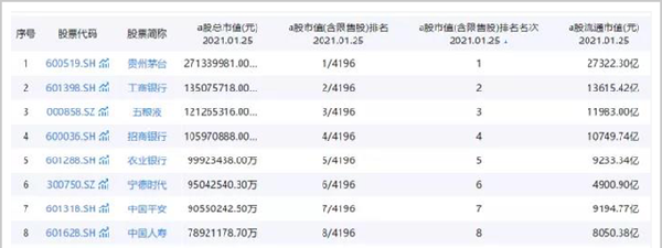 到了今天,A股前10大市值公司中,除了银行和保险之外,新上榜的是高端白酒的代表贵州茅台和五粮液,以及新能源汽车产业链龙头宁德时代,其中贵州茅台更登顶A股市值之首。
