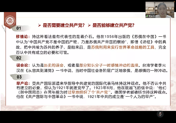 樊宸余首先从“是否需要建立共产党”、“是否能够建立共产党”两大问题出发简要介绍中国共产党建党的背景。随后她从一大参会人员的视角出发,带领大家了解中共一大的召开时间、地点变化以及会议内容。她向同学们呼吁:作为新时代的青年人应当弘扬红船精神,牢记初心使命,坚定不移的追随共产党的领导,担起自己的使命。