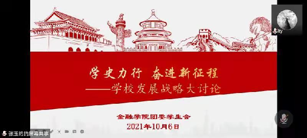 为积极响应习近平总书记所提出的“十四五”规划,提高学生政治思想,金融学院团委学生会于10月6日以线上线下相结合的方式召开了“学史力行,奋进新征程”——学校发展战略大讨论会议。学院团委书记顾正云、团委副书记朱凯、团委副书记管承瑜、团委学生会二十余位学生骨干参与了本次会议。