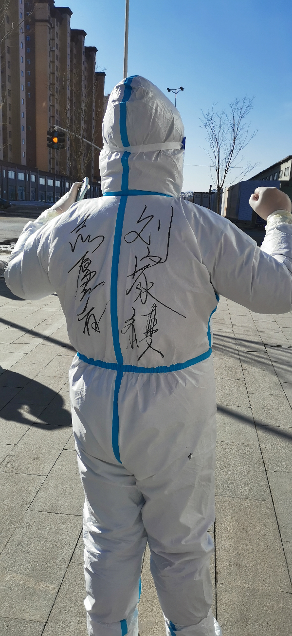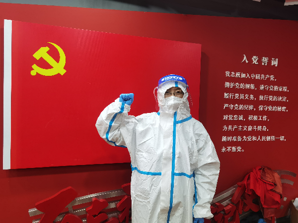 在有1例确诊、3例无症状感染者的封闭小区内,行政教工党支部书记陈京苗不惧风险,第一时间通过社区党群服务中心报名志愿服务,穿上厚重的防护服成为了一名核酸检测志愿者,负责黏贴核酸试管信息标签,从下午五点奋战到午夜十二点。在朋友圈,她郑重写到“心中有信仰,脚下有力量”。