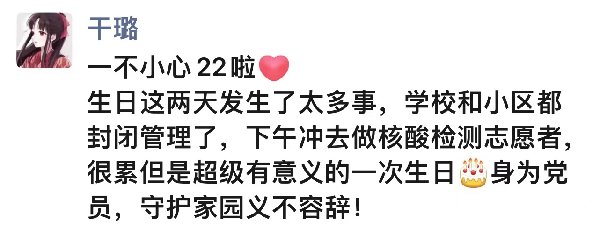“很累但是超级有意义的一次生日,身为党员,守护家园义不容辞!”这是2018级国际化(国际金融方向)1班学生党员干璐在生日当天写下的朋友圈。在疫情中迎来22岁生日的她,选择在封闭管理的小区内做核酸检测志愿者,在为人民服务中度过一个特殊的生日。
