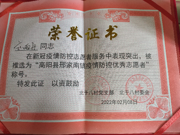 学生第五党支部赵雨丹获评”疫情防控优秀志愿者”