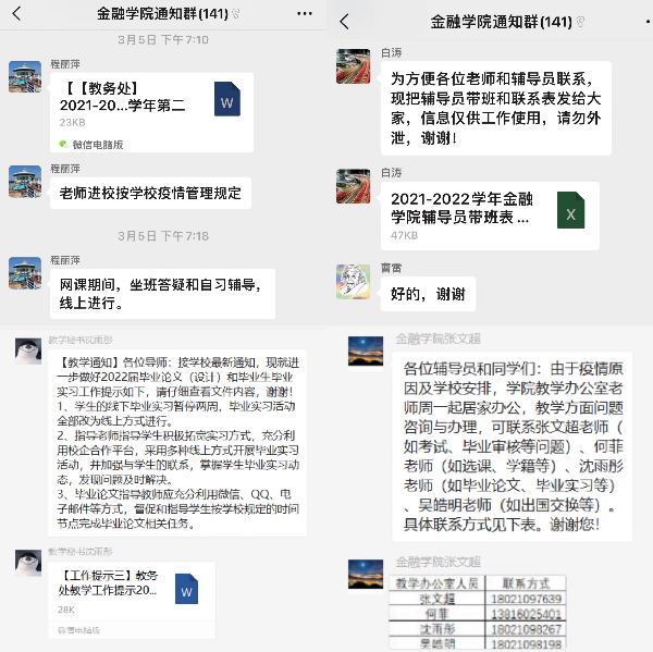 作为抗疫党员先锋队与守护学生服务队,金融学院学生工作者队伍及时召开线上会议认真学习学校具体工作规定与流程,积极沟通各项工作事宜,通过电话、微信、QQ等方式与同学们保持密切联系和深入沟通,根据疫情变化及时掌握校内校外学生状态,迅速统计核酸检测情况,解决同学们在线上学习、外出实习、日常生活等多方面的问题,关心关注大家的思想动态,尽力解决他们的后顾之忧,为同学们增添更多共渡难关的信心与力量。其中辅导员管承瑜老师更是成为学院坚守在校园内的“独苗”,主动承担起众多服务同学的事务性工作。