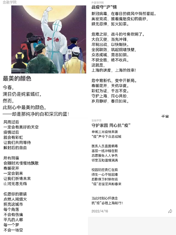 为此,校工会联合教职工海棠诗社、金融学院工会面向全体教工发起了弘扬抗疫精神最美育人原创诗歌征集活动。呼吁爱好诗歌的教职工,以艺抗疫,以诗战疫,用诗歌和镜头记录抗疫路上无私付出的立信人,展现守护校园内外的美丽瞬间,分享背后的暖心故事和育人理念。用诗歌凝聚力量,鼓舞意志,传递真情,共克时疾,为上海加油,为中国加油!