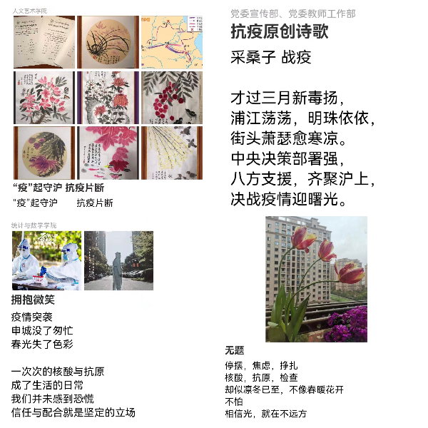 征集活动发出后,便受到广泛关注,各单位教职工积极参与,本次活动共征集12家单位34位教工提交的42首原创诗歌,体裁涵盖格律严谨的古体诗词和形式自由、近乎散文的现代诗歌,有些作品还以图文并茂长短的方式、长短错落的诗行传递真情。每一首作品都用最真挚的语言,反映了当前奋战在线教学、论文指导、科研攻关、后勤保障、逆向奔赴参与校园值守等工作一线的教职员工防疫抗疫的实录,也表达了对奋战抗疫一线的医务工作和志愿者的赞美以及对邻里守望互助和后勤保供团长们的敬意。