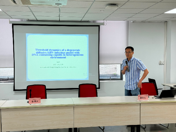 张珺涵报告题为“复杂网络在技术创新中的应用”,她由自身的研究思路出发分享了研究技术创新的历程,即从创新链到创新网络再到基于复杂网络的协同创新,提出了独到见解,并展望了未来的研究方向。杨瑜报告题为“Threshold dynamics of a degenerate diffusive HBV infection model with DNA-containing capsids in heterogeneous environment”,将微分方程与传染病交叉融合,考虑异质环境中一类含有病毒DNA核衣壳的退化扩散HBV感染模型的阈值动力学。交流研讨环节,参会师生就如何在技术创新的研究中将金融学与统计学进一步交叉融合、以及微分方程模型的指标选取和依据等问题进行了深入探讨,现场气氛热烈活跃。