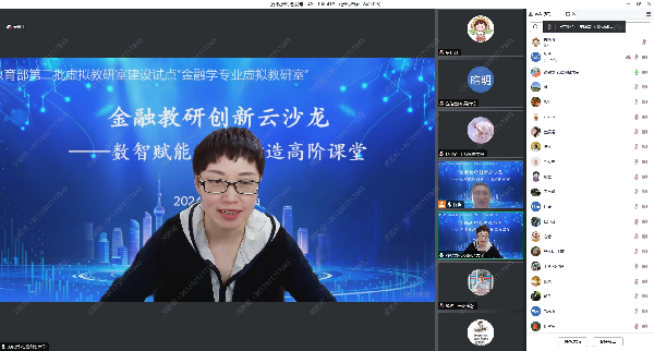 10月17日下午,教育部金融学专业虚拟教研室在线举办“金融教研创新云沙龙-数智赋能创新 打造高阶课堂”教研活动。活动特别邀请国家级一流本科课程主讲人、全国高校教师教学创新大赛一等奖及教学设计创新专项奖获得者,安徽财经大学廖晓慧老师分享智慧课程建设经验。来自虚拟教研室共建单位的100余位教师参加,活动由金融学院副院长陈兵主持。
