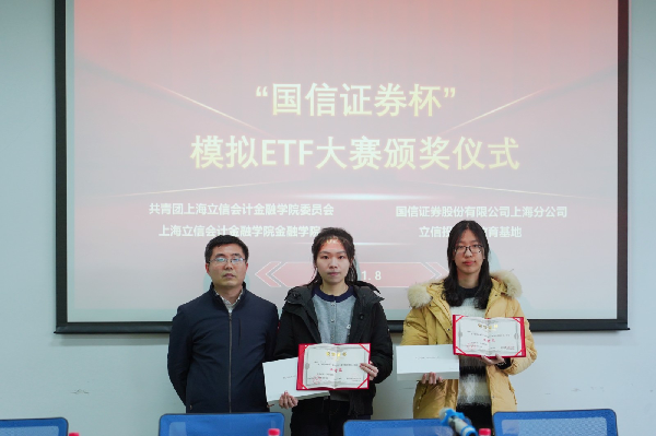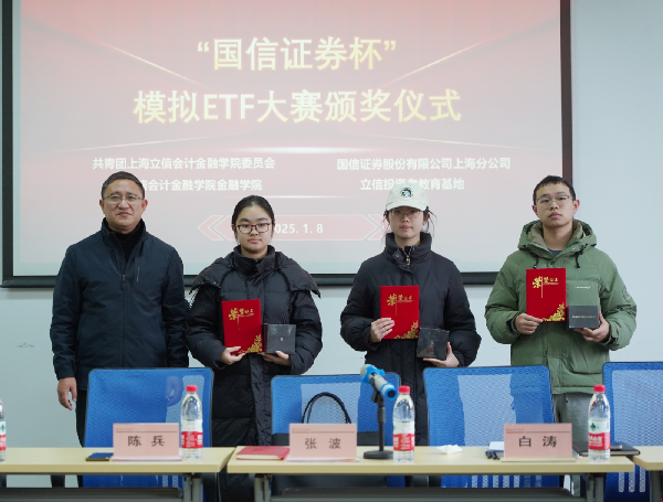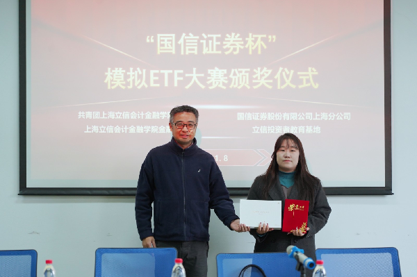 2025年1月8日,“国信证券杯”模拟ETF大赛颁奖仪式在金融学院举行,上海立信会计金融学院金融学院党委副书记白涛、副院长陈兵、杨凌霄老师、马晓雅老师、国信证券上海分公司总经理助理张波、国信证券上海分公司张杨路营业部总经理张敏、大赛获奖选手代表出席了本次颁奖仪式,会议由金融学院团委副书记马晓雅主持。