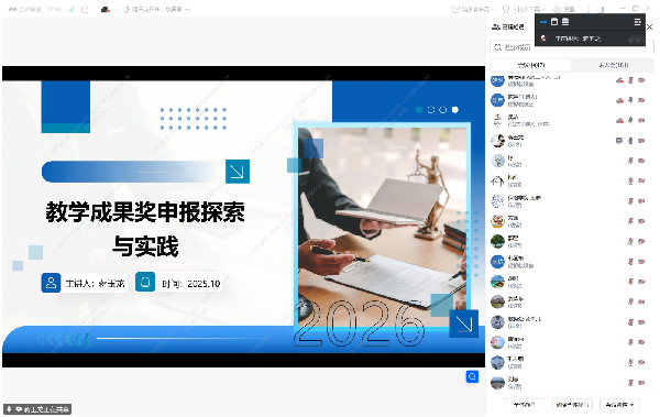 2025年10月14日上午,教育部金融学专业虚拟教研室在线举办“教学成果奖申报辅导”师资培训。特别邀请复旦大学教师教学发展中心副主任蒋玉龙教授分享经验,金融学院副院长吴洁(主持行政工作)、副院长刘晓明和陈兵及来自校内其他学院和全国多所高校的50余位教师参与,活动由金融学院副院长陈兵主持。