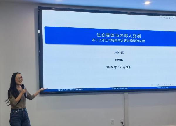 周小夏发表题为“社交媒体与内部人交易:基于上市公司微博与大语言模型的证据”的主题演讲。研究聚焦于中国资本市场特点,探讨了上市公司管理层是否利用高掌控度的微博平台进行策略性披露,以配合的机会主义内部人交易。该研究创新了传统文本分析方法,丰富信息披露与市场操纵的相关研究。