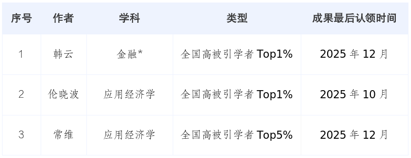 在激烈的竞争中,金融学院韩云、伦晓波、常维三位教师凭借卓越的学术成果与影响力成功上榜。其中,韩云与伦晓波两位教师入选全国前1%高被引学者,常维教师入选全国前5%高被引学者。