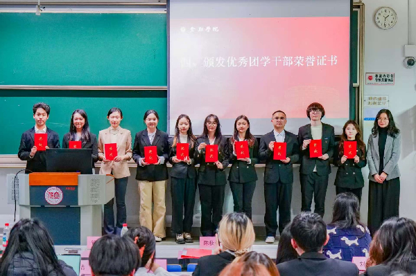 管承瑜为优秀团学干部颁发荣誉证书,表彰他们在工作中的突出表现与卓越贡献。