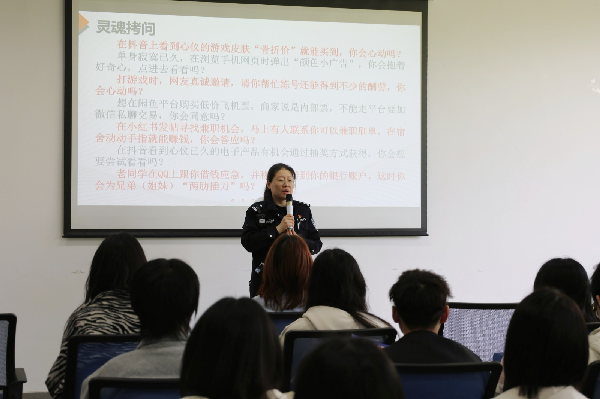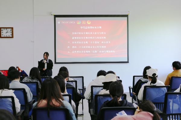活动中,张翊昕警官以“防范于心反诈同行”为主题,立足高校反诈工作实际,结合校园典型诈骗案例,系统梳理大学生高频遭遇的电信网络诈骗类型与作案手法,深入剖析诈骗分子利用学生心理弱点设下的常见陷阱。张警官重点解读帮信罪、掩隐罪等相关法律知识,提醒同学们严守法律底线。同时,围绕“不轻信、不透露、不转账”核心防范原则,介绍“金护”反诈APP、803反诈智能体及96110反诈劝阻专线的使用方法,切实帮助同学们提升风险识别与自我保护能力,守护个人财产与信息安全。周昕怡围绕总体国家安全观展开系统阐释,全面解读政治安全、国土安全、经济安全、文化安全、社会安全、军事安全等重点领域核心内容,帮助同学们深刻把握总体国家安全观的丰富内涵与时代实践要求,厚植国家安全意识。